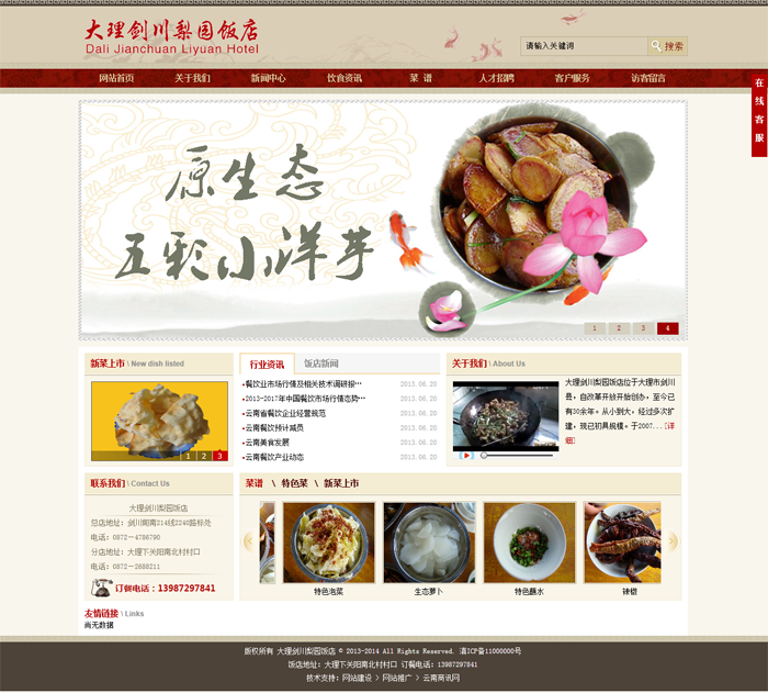 大理劍川梨園飯店位于大理市劍川縣,自改革開放開始創(chuàng)辦,至今已有30余年。從小到大,經(jīng)過多次擴建,現(xiàn)已初具規(guī)模。于2007年在大理市下關(guān)開設(shè)分店。本店主要以大理白族清燉、黃燜雞為主,土雞來源于劍川山區(qū)農(nóng)家放養(yǎng),在老人(趕馬幫)家傳烹調(diào)技術(shù)之上加以改進完善。其次用劍川高山純天然綠色的紫洋芋(七彩洋芋)蘿卜,以獨特的白族農(nóng)家風(fēng)味精心制作出油炸七彩洋芋、清湯蘿卜,再次以大理劍川自己種植的獨特的大辣椒為主料制作的油炸辣椒,別具風(fēng)格,辣中帶甜?;旌弦员镜靥禺a(chǎn)蓮花白和紅辣椒根據(jù)傳統(tǒng)的制作方法制作的泡菜。將各自的營養(yǎng)價值和特色,完美的搭配到一起。真正做到地道的大理白族農(nóng)家風(fēng)味。已得到消費者的一致贊同。