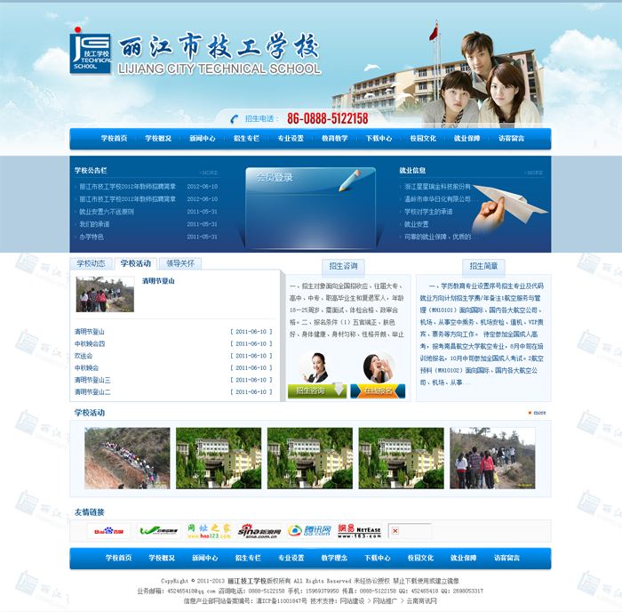 麗江市技工學校是經(jīng)云南省人力資源和社會保障廳批準成立、麗江市勞動和社會保障局主管、麗江市教育局備案的全日制中等技校,學校座落在象山腳下、麗江古城旁,校園占地面積48畝,環(huán)境幽雅,交通方便,建校十多年來為社會培養(yǎng)和輸送了上萬名技能人才,多家新聞媒體報道了學校先進的辦學理念和優(yōu)良的辦學成果?! ≡谑∪肆Y源和社會保障廳、市委、市政府以及相關部門領導的關心支持下,學校勵精圖治、奮力拼搏、與時俱進,實現(xiàn)了跨越式的大發(fā)展,現(xiàn)已擁有三個教學區(qū),能容納1500人的辦學規(guī)模,學校師資力量雄厚,擁有一批敬業(yè)向上、關愛學生、專業(yè)技能過硬的雙師型教師隊伍。學校高度重視教師的師德師風建設,注重教師的職業(yè)素養(yǎng)和職業(yè)技能提高,加快推進學科帶 頭人的培養(yǎng)步伐。