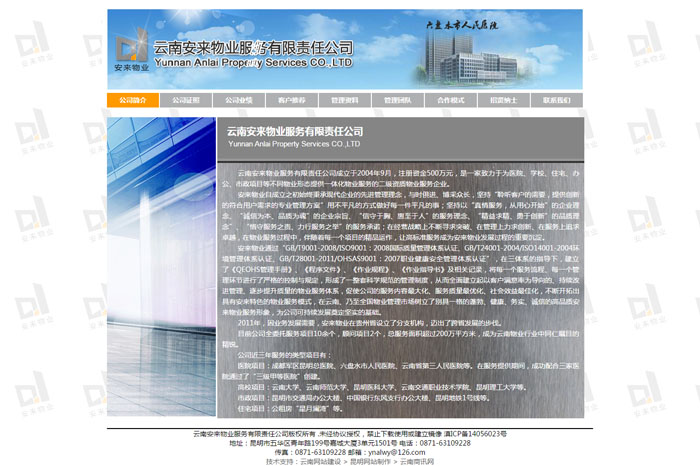 云南安來物業(yè)服務(wù)有限責(zé)任公司成立于2004年9月,注冊資金500萬元,是一家致力于為醫(yī)院、學(xué)校、住宅、辦公、市政項目等不同物業(yè)形態(tài)提供一體化物業(yè)服務(wù)的二級資質(zhì)物業(yè)服務(wù)企業(yè)。
