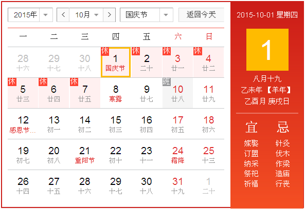 根據(jù)最新放假安排,2015年我國(guó)國(guó)慶節(jié)從10月1日開(kāi)始至7日放假調(diào)休,共7天。10月10日(星期六)上班